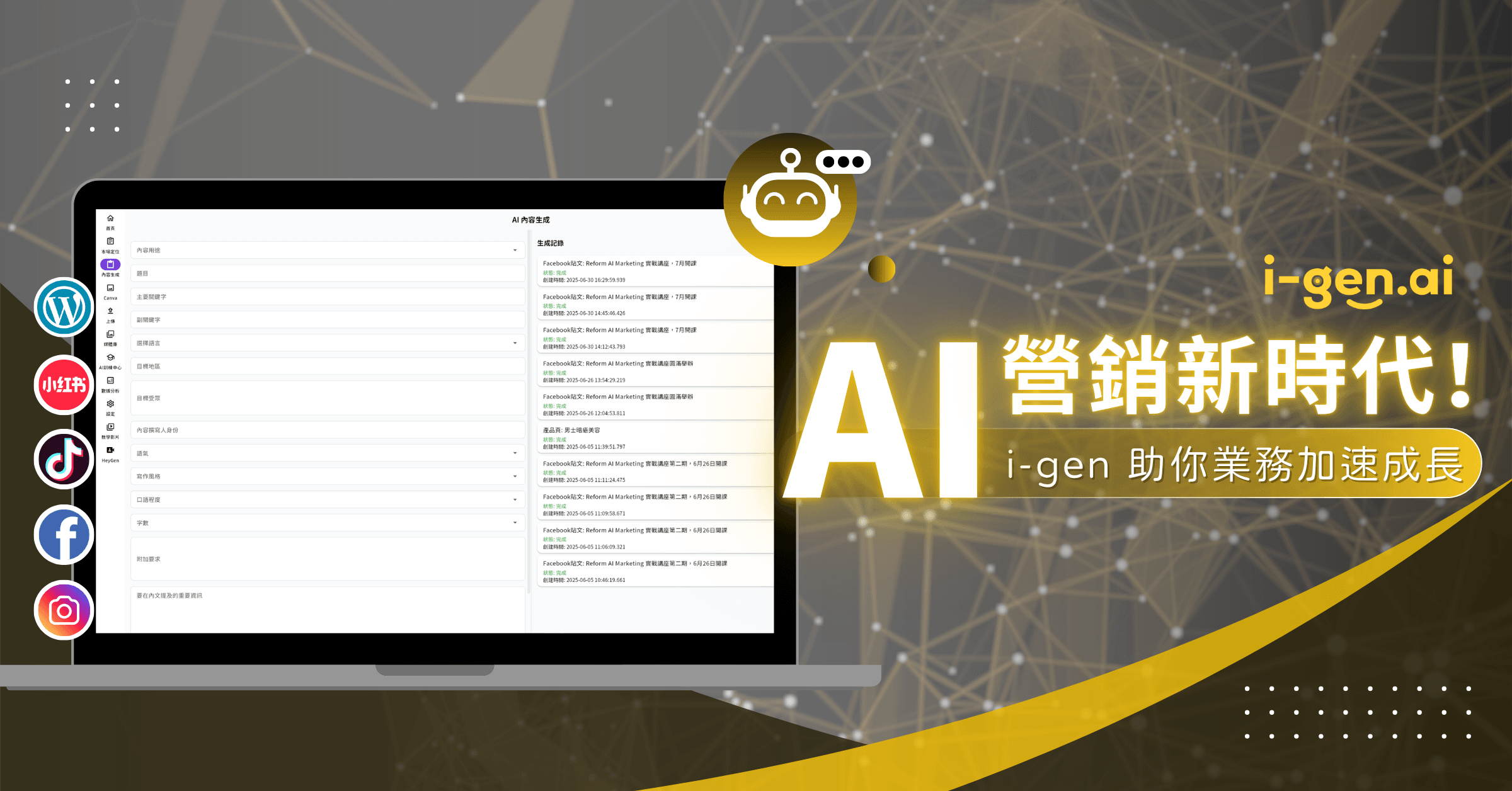 Don’t let talent and cost become a stumbling block to your marketing. i-gen is your smartest, most reliable, and most accurate marketing partner, from product positioning to marketing content creation, multi-platform publishing, performance analysis to optimization, all in one stop to complete the entire marketing front.