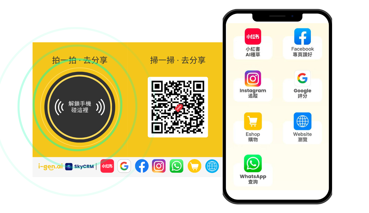 i-gen拍拍卡是一張結合NFC技術與後端AI系統的智能名片。顧客無需下載APP,只要用手機輕拍,即可進入品牌專屬互動門戶,包括: