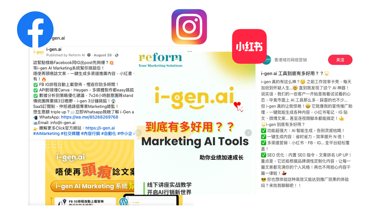 • 高效產出貼文/影片腳本:輸入主題和圖片,3秒內生成適用於FB/IG/小紅書/網站等多平台的文案或腳本。